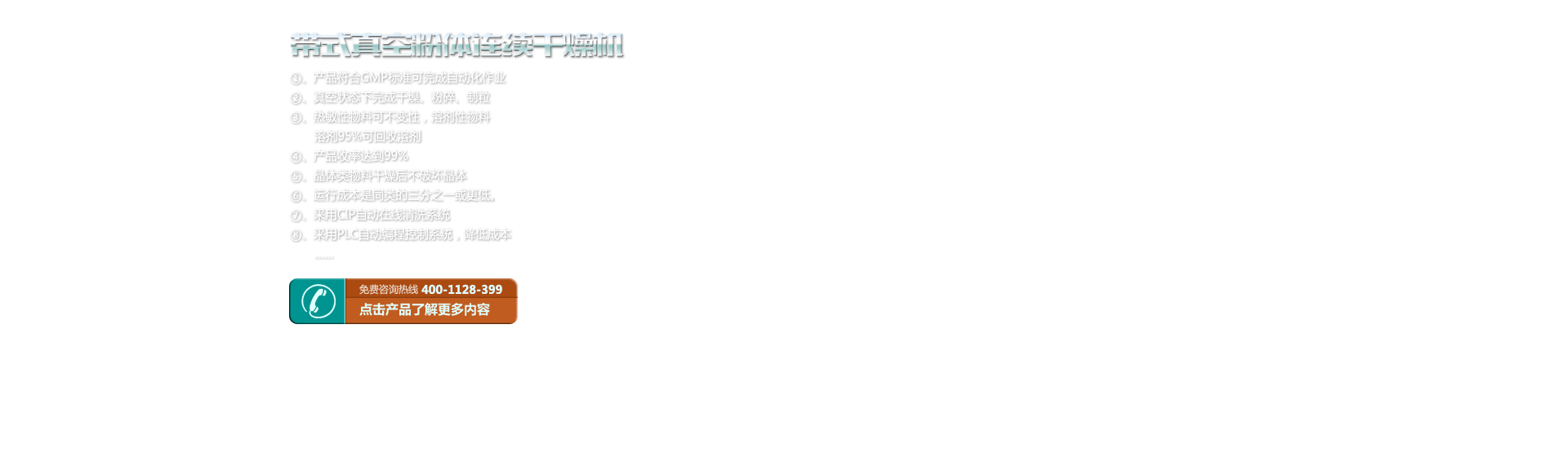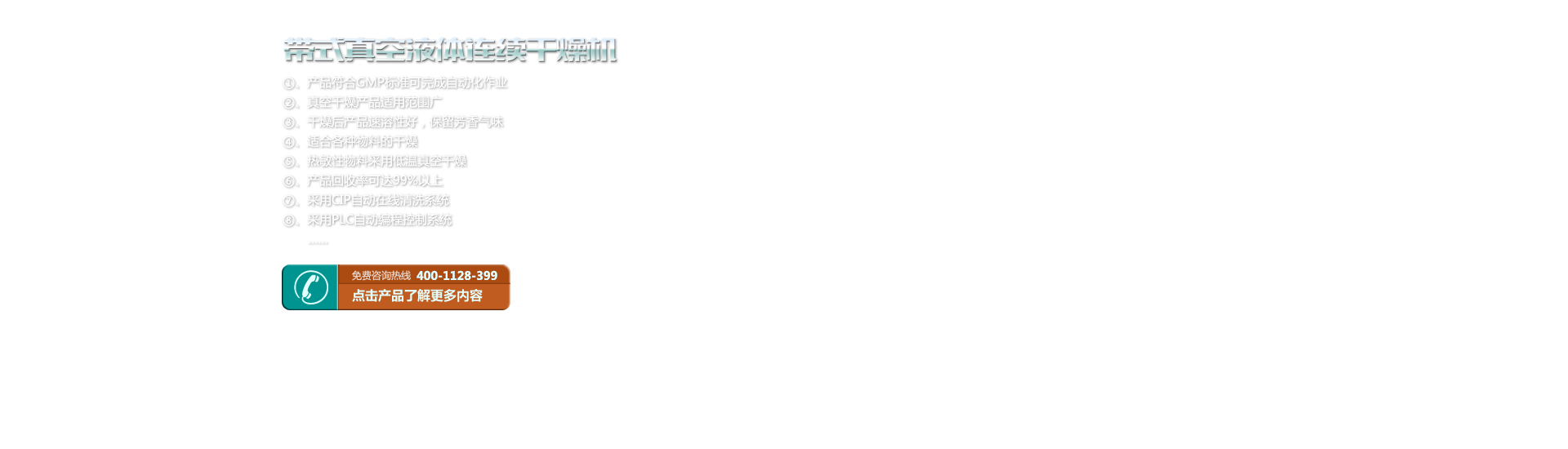 該機(jī)為提醇的高濃度、高粘度的中藥浸膏解決了一大難題,以往采用離心噴霧,因為溫度,熱敏性成份遭破壞、易粘壁;采用真空烘箱因時間長、能耗高、易染菌、易返潮,無法連續(xù)生產(chǎn),均達(dá)不到GMP質(zhì)量標(biāo)準(zhǔn)。 本機(jī)克服上述存在的許多問題,即干燥溫度低,有效成分不流失,干燥時間短、能耗低、無污染,能連續(xù)生產(chǎn)。